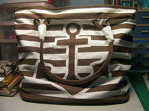 這個帆布袋是上星期六在菜市場裡買的~ 花了五百塊大洋~會想買它原因有二.... 一是可以當媽媽袋, 二是拿來做為手作袋~ 以後出門去上課, 要裝工具什麼的, 一袋搞定!!它可以裝下12吋的折線板和美編紙~ 實不實用啊? 當然嘛實用~ 光是能裝這兩樣東西就令我大大的滿意了~總比之前只要去參加聚會時, 手上拎一堆東西來得好~ 如果再放進一台興趣機呢? 當然嘛放得下....